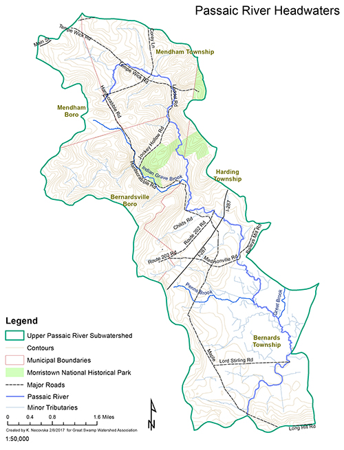 The Passaic River Headwaters is formed by the union of three tributaries, originating in Mendham Township, Mendham Borough, and Bernardsville.