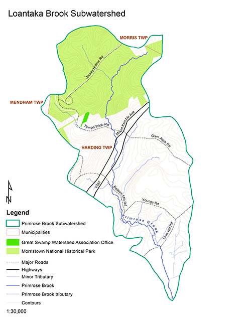 Primrose Brook has three major tributaries that feed the main brook. The westernmost tributary begins in Mendham, west of Tempe Wick Road along the intersection of the Morris Area Girl Scout property and Morristown National Historical Park’s Jockey Hollow. It crosses over Tempe Wick Road to join the second tributary south of Jockey Hollow before once again crossing over Tempe Wick Rd just above Route 202. The second tributary begins within Jockey Hollow and is the most protected and pristine waterway in the subwatershed. This section of Primrose, which NJ DEP has labeled as a Category 1 Trout Producing stream, runs through Jockey Hollow for over a mile before joining the first tributary south of the park. The third tributary begins south of Route 202 off Meadow Lane near the back of the Harding School property. It then flows south-west into Mount Kemble Lake and joins the mainstem of the stream south of Bailey’s Mill Road.